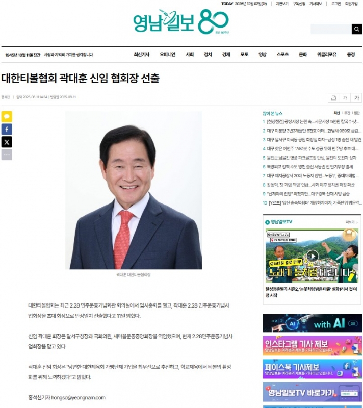 대한티볼협회 곽대훈 신임 협회장 선출(영남일보)