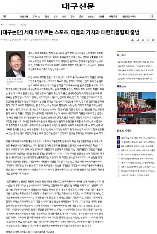 대구논단_세대 아우르는 스포츠, 티볼의 가치와 대한티볼협회 출범 작성자 관리자 등록일 2025.08.24 11:20:43 조회 3 clear:both;"> 목록 이전글 곽대훈 대한티볼협회 회장 취임식 가져(매일신문) 다음글 제1회 대한티볼협회장배 전국티볼대회(매일신문)